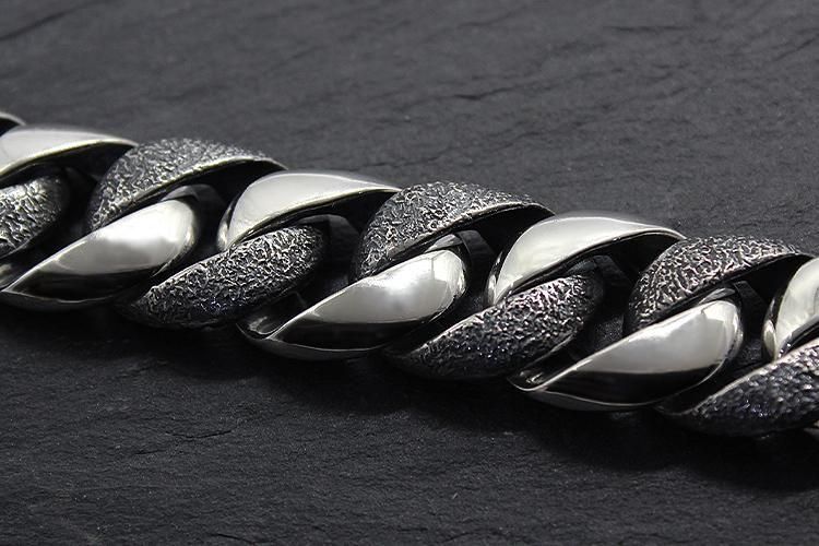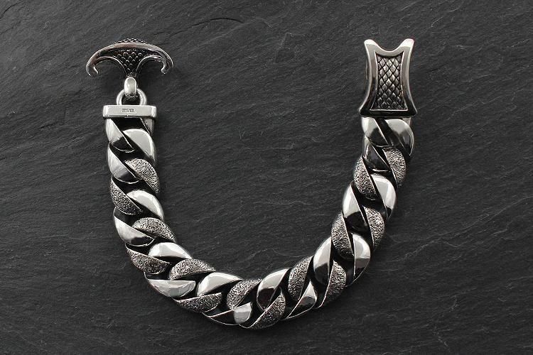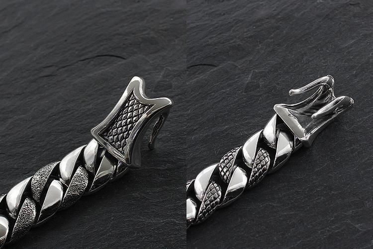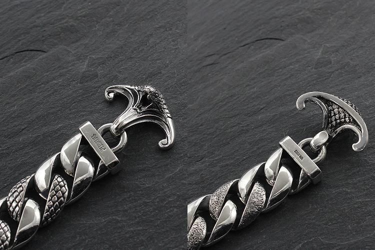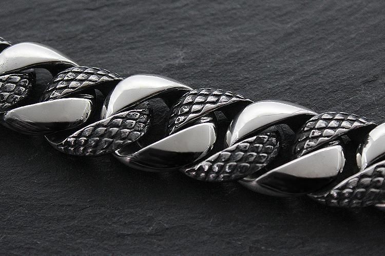 シルバー925製のブレスレット。細かい鱗模様を丁寧に刻み込み、重厚感と繊細な輝きを兼ね備えたデザインです。無骨で存在感のあるアクセサリーとして、長く愛用するほどに深みを増していきます。